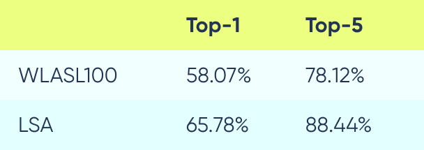 To estimate the accuracy for LSA, we take a “train” set as given and then classify the holdout set based on the closest vectors from the “train” set. This is done using the model trained on WLASL100 dataset only, to show how our model has zero-shot capabilities.